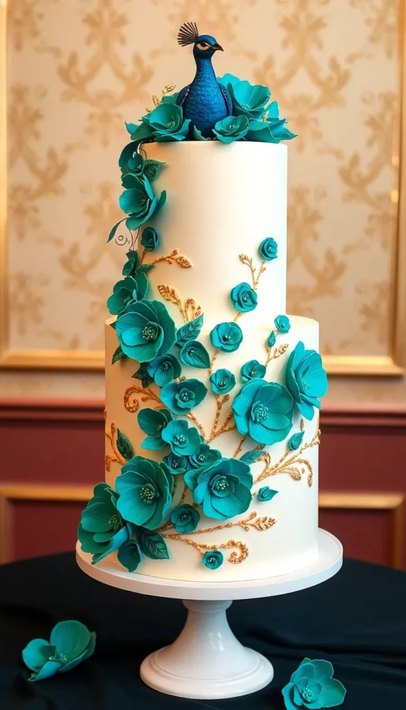 Sugar flowers in teal, turquoise, and gold enhance the beauty of feather-inspired designs.