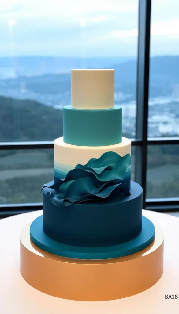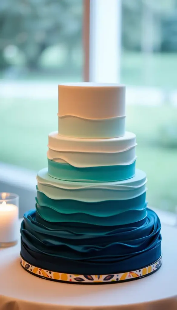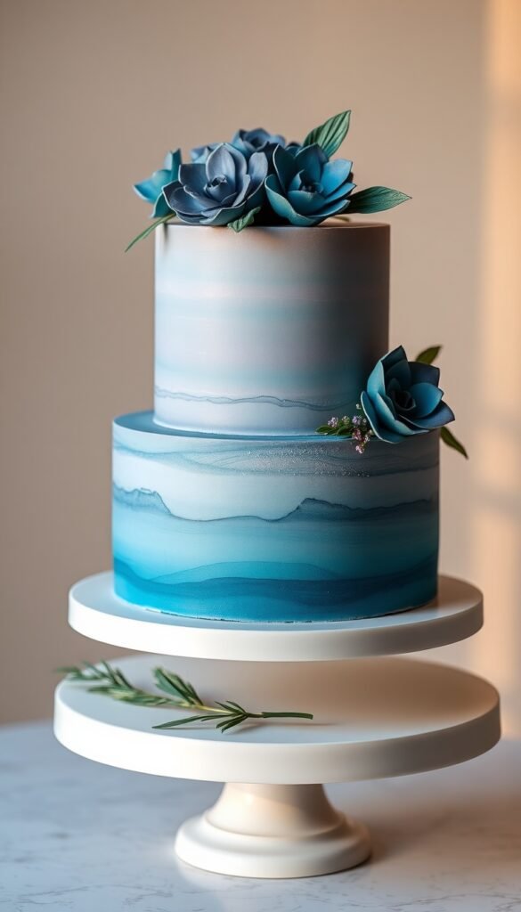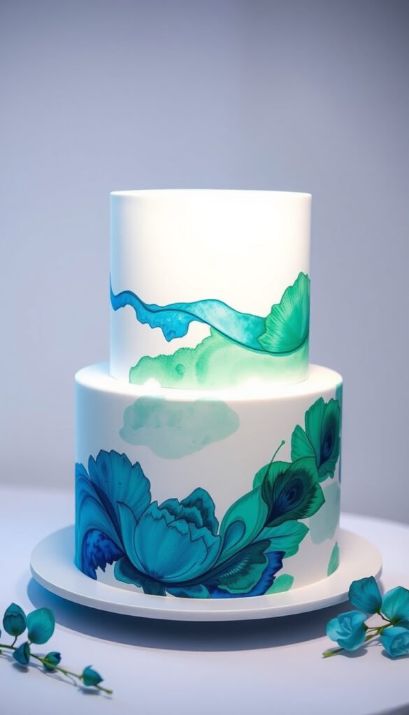 Soft watercolor shades of blue and green blend beautifully, creating an artistic and modern wedding cake.