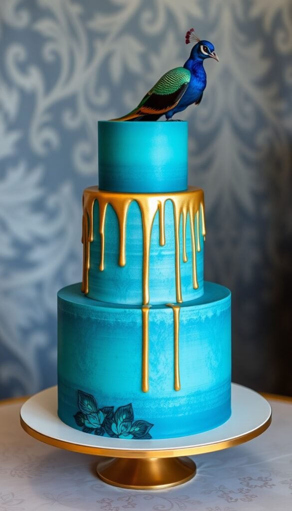 A stylish cake featuring metallic gold drip cascading over peacock-colored tiers.