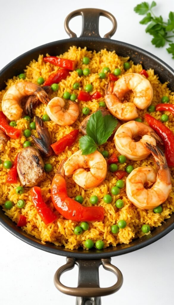 - Layer chicken, shrimp, peas, and bell pepper on top.