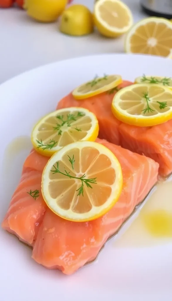 - Place salmon on a heatproof plate. Top with lemon and dill.