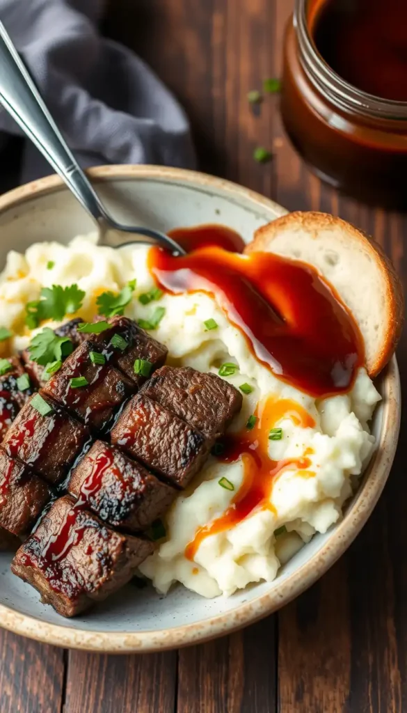 Ingredients: Steak, mashed potatoes, BBQ sauce