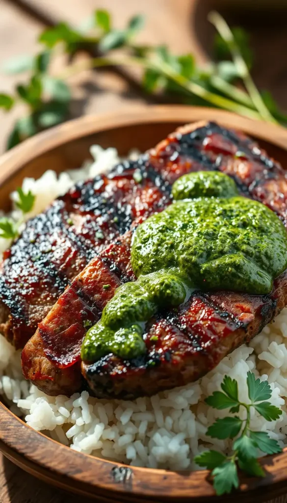 Ingredients: Grilled steak, rice, chimichurri sauce