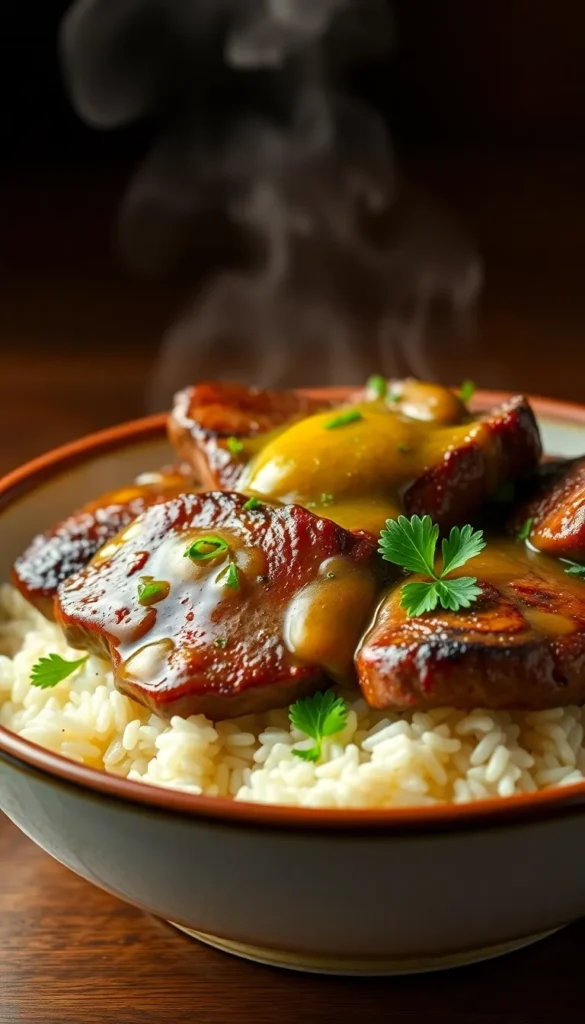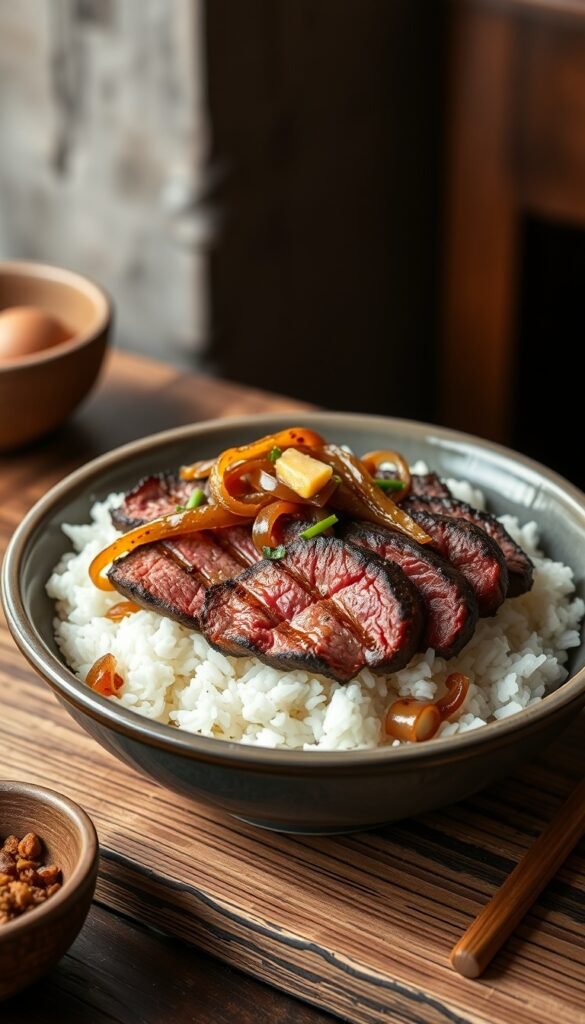 Instructions: Grill steak to medium, slice thin, and serve over rice with buttery onions.