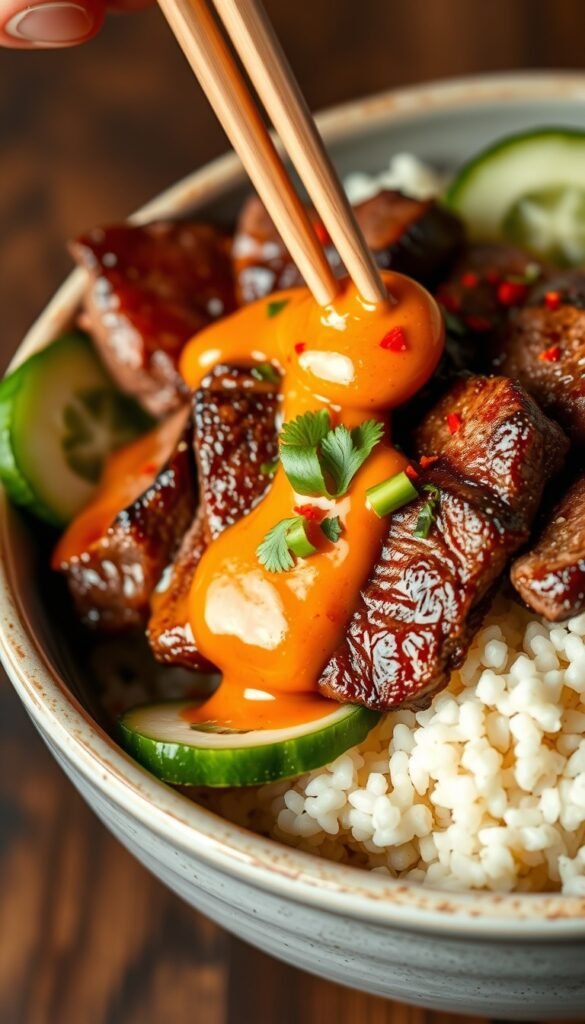 Ingredients: Steak, rice, sriracha mayo, cucumber