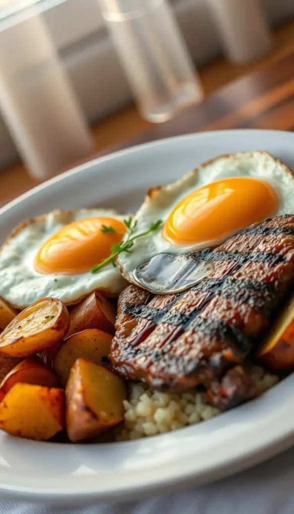 Ingredients: Steak, fried eggs, potatoes