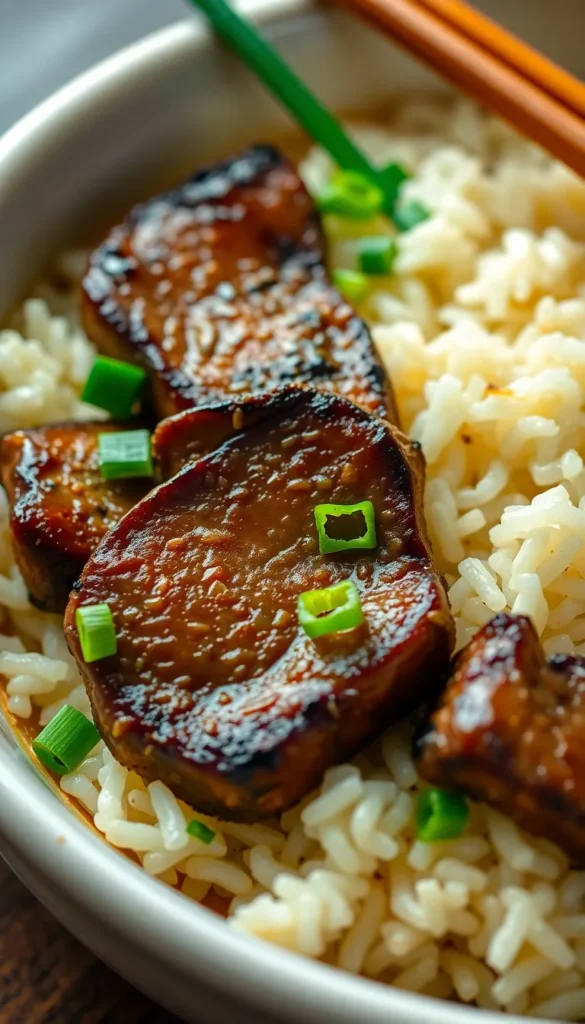Ingredients: Steak, rice, ginger soy sauce, scallions