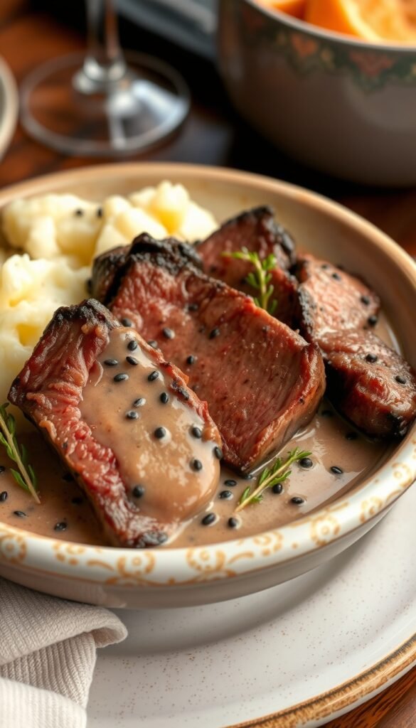 Ingredients: Steak, peppercorn sauce, mashed potatoes
