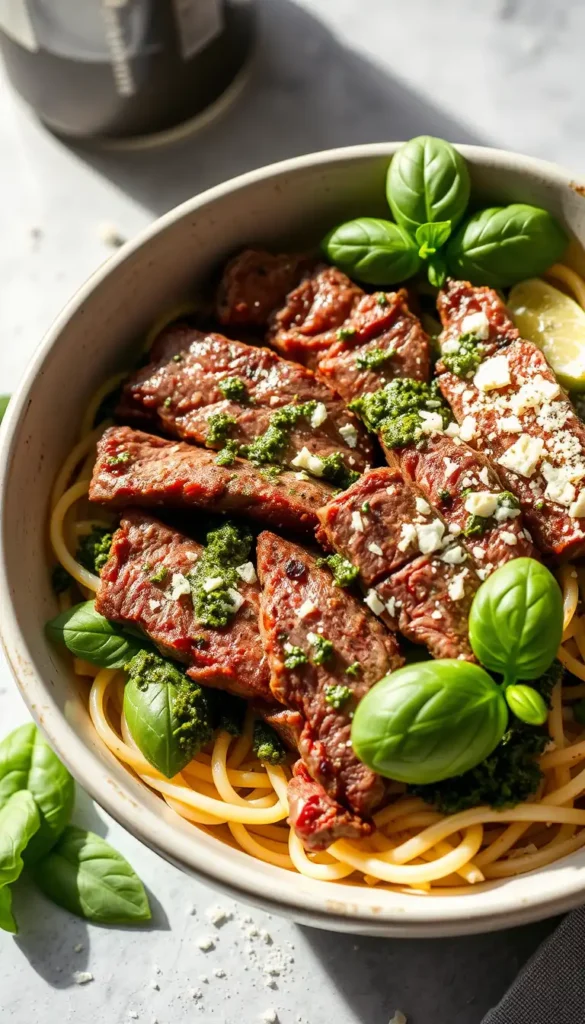 Instructions: Toss steak with basil pesto and pasta.