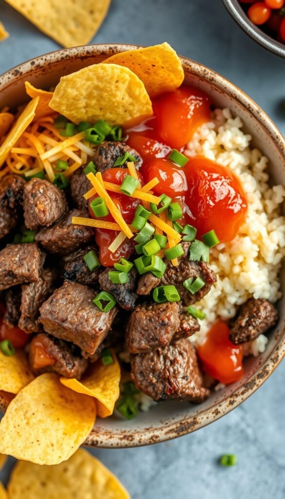 Instructions: Taco-style steak bowl with fresh salsa.