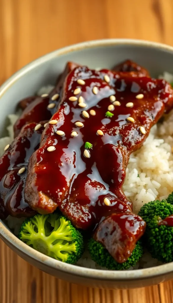 Instructions: Cook steak, glaze with teriyaki sauce, and serve over rice.