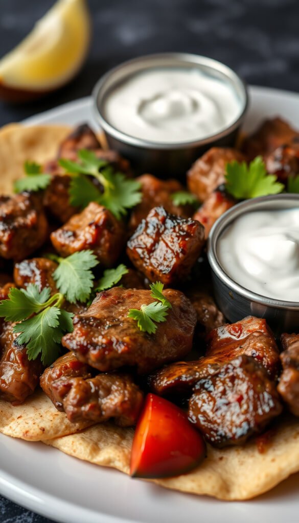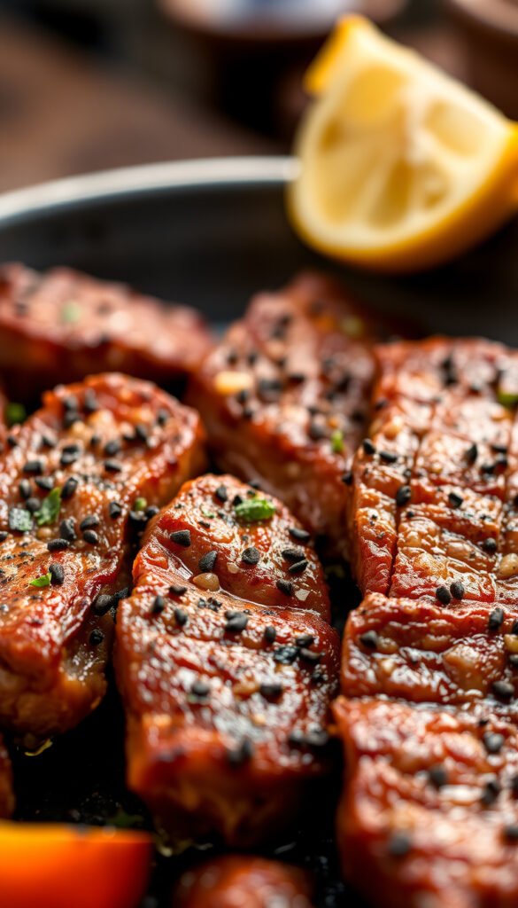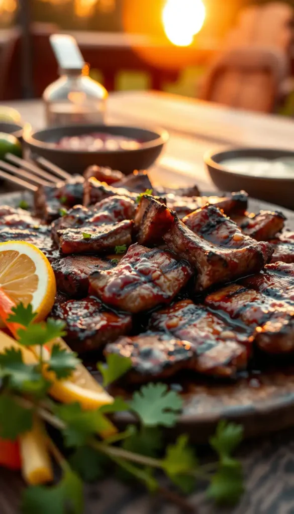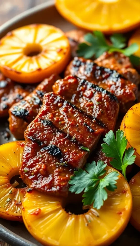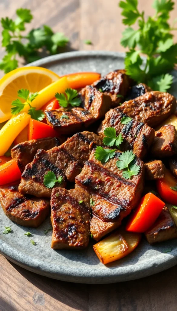 Marinated steak grilled over an open flame for smoky goodness.