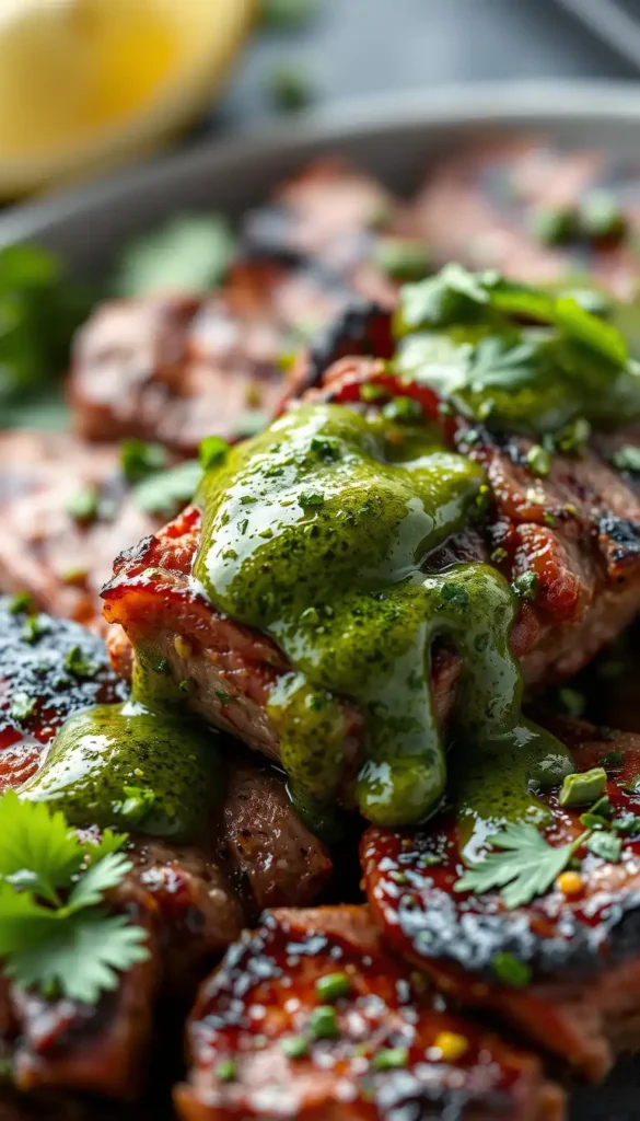 Fresh herb sauce drizzled over grilled steak.