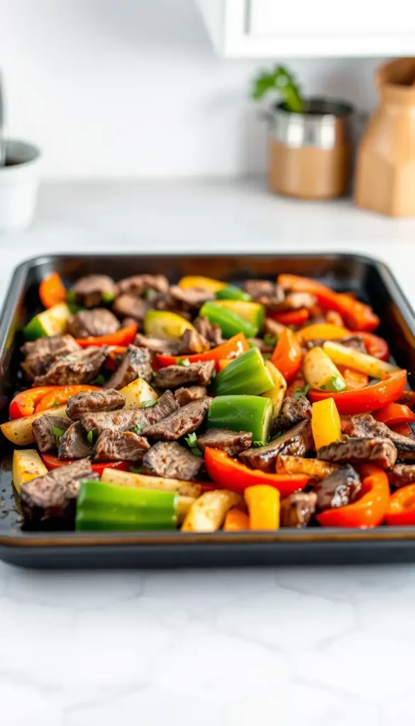 Easy sheet-pan steak fajitas baked with peppers and onions.
