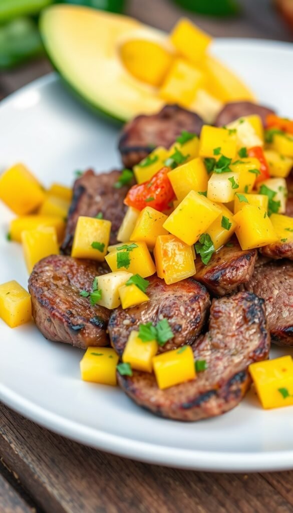Sweet mango balances savory steak perfectly.