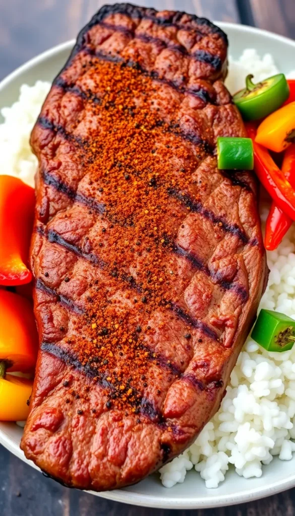 Season steak generously, grill, and serve with sautéed peppers over rice.
