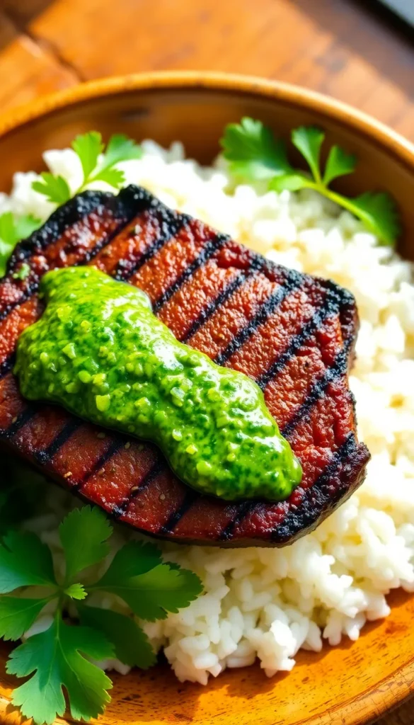 Grill steak and top with fresh chimichurri sauce before serving over rice.