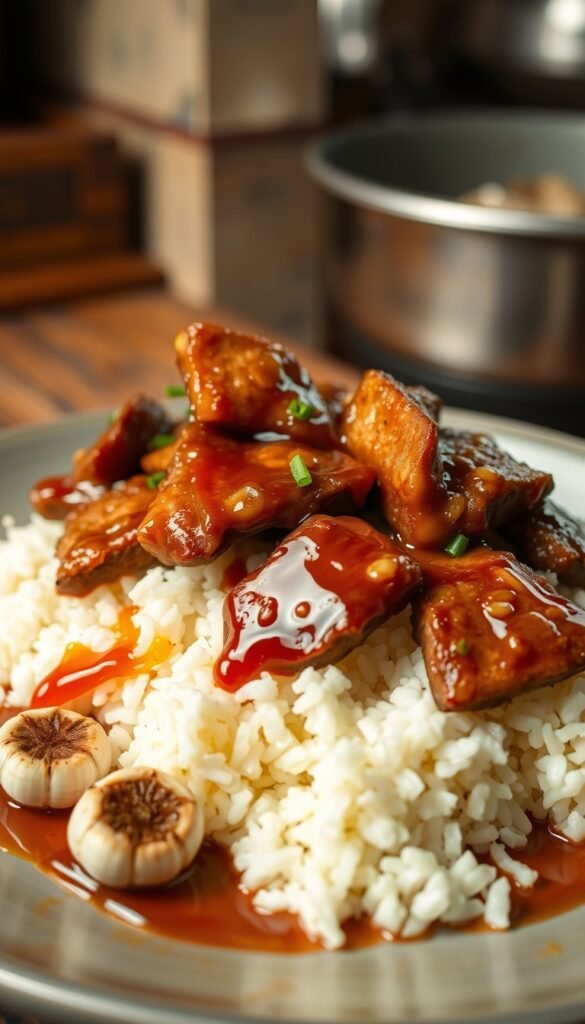 Ingredients: Steak, rice, soy sauce, garlic