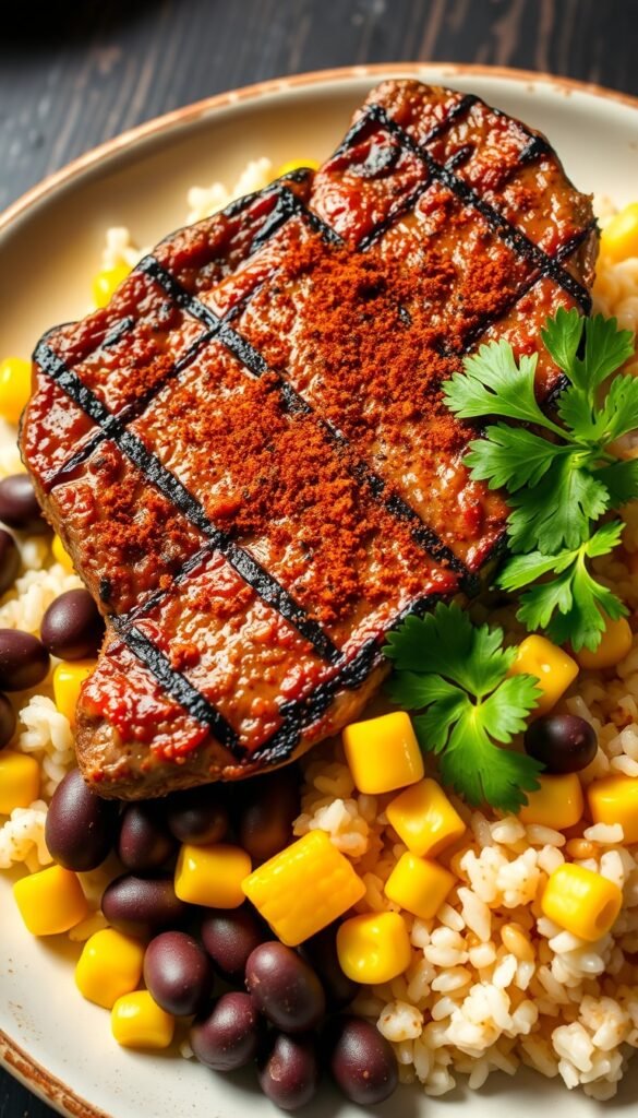 Season and grill steak, slice, and serve over rice with beans and corn.