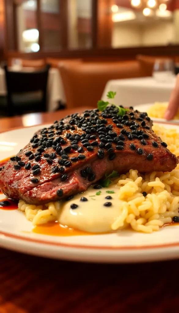 Ingredients: Beef steak, rice, crushed black peppercorns, cream, butter