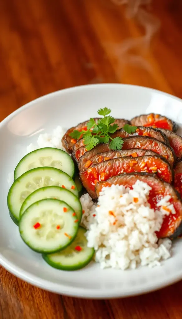 Ingredients: Sirloin steak, rice, gochujang, soy sauce, garlic, and cucumber