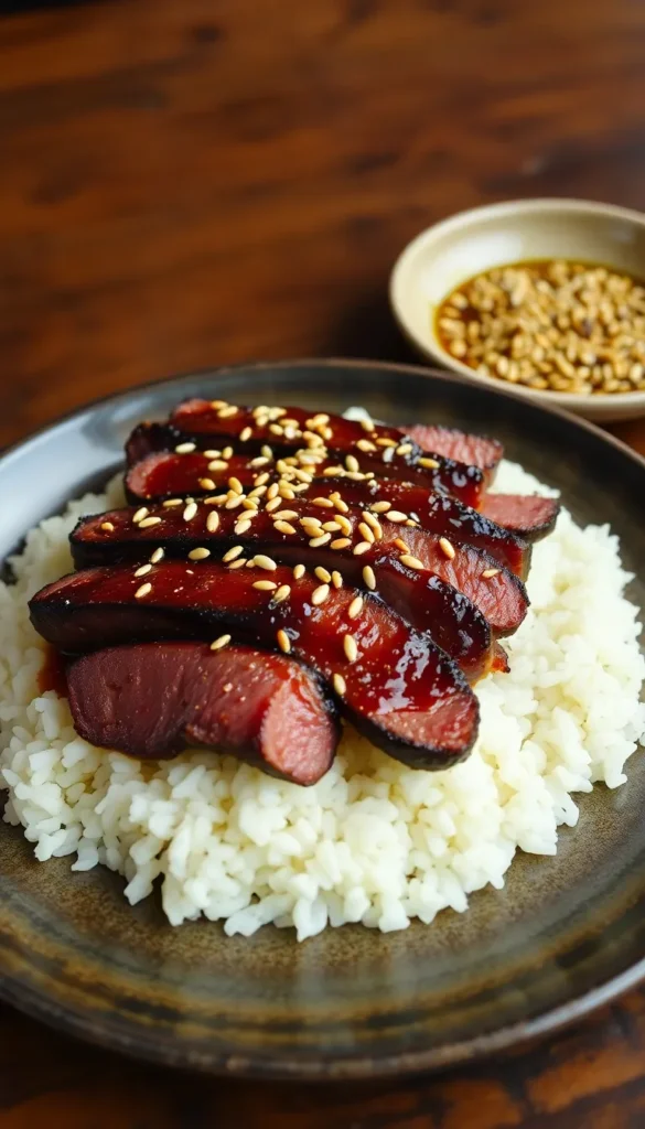 Ingredients: Seared steak, rice, soy sauce, sesame oil