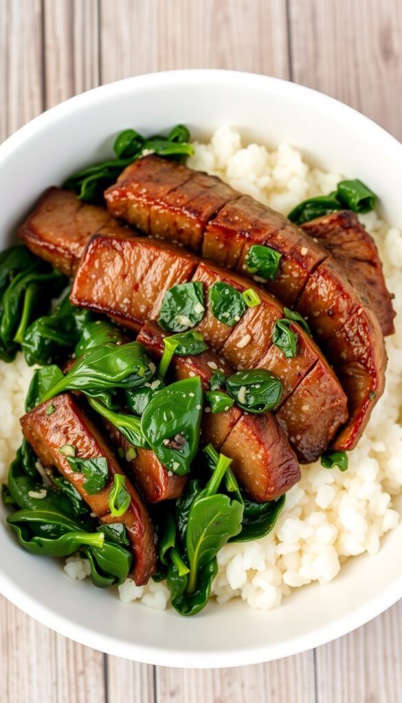 22. Steak and Spinach Rice Bowl