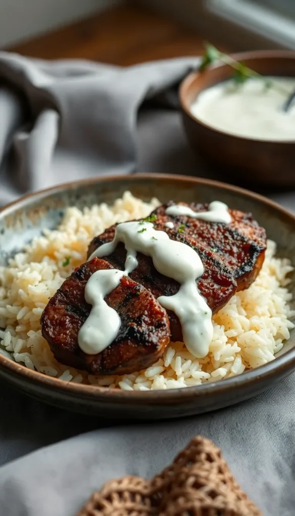 Ingredients: Steak, rice, yogurt, garlic