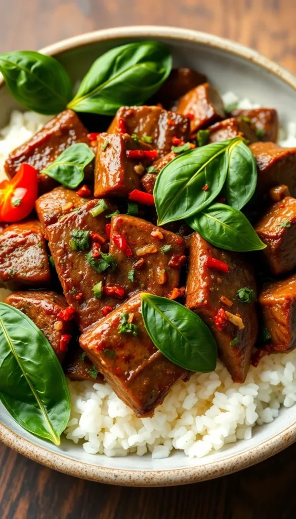 Stir-fry steak with garlic and chili, finish with basil, and serve over rice.